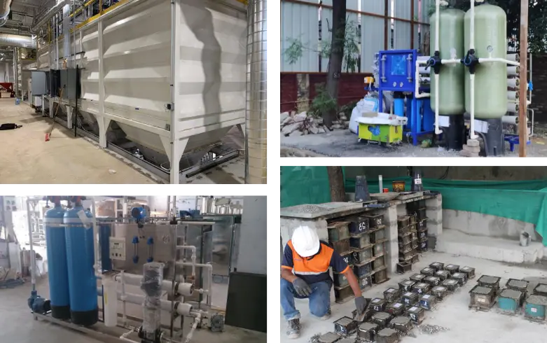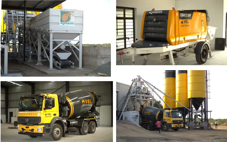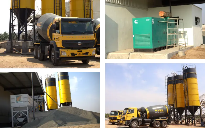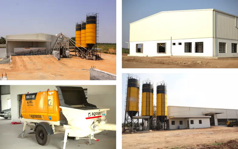 Vel Industries, spanning 2.60 acres, hosts advanced facilities for Ready-Mix Concrete (RMC) and FlyAsh brick production. Our RMC unit includes an SP40 Aquarius plant and Bharath Benz Transit mixers for efficient delivery, with an in-line pump for vertical distribution up to 10-storey buildings. We maintain consistency through a 1600 sq ft bulk storage yard and covered material storage loading bins. Concrete production utilizes RO water with TDS under 50 ppm, and our QC testing labs ensure strict quality control. In our FlyAsh bricks unit, German-engineered Hydro+Vibro technology yields high-strength bricks, supported by a 12,500 sq ft production shed and RO water for production and curing.