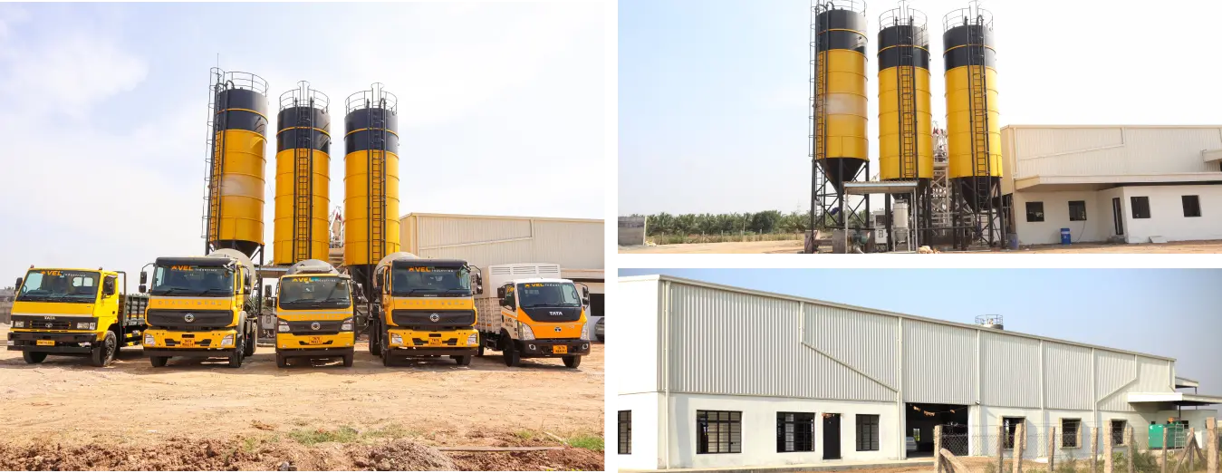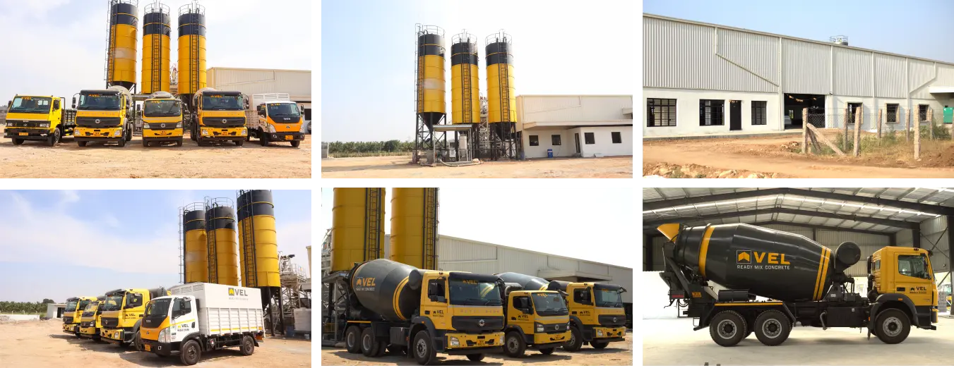 Vel Industries, spanning 2.60 acres, hosts advanced facilities for Ready-Mix Concrete (RMC) and FlyAsh brick production. Our RMC unit includes an SP40 Aquarius plant and Bharath Benz Transit mixers for efficient delivery, with an in-line pump for vertical distribution up to 10-storey buildings. We maintain consistency through a 1600 sq ft bulk storage yard and covered material storage loading bins. Concrete production utilizes RO water with TDS under 50 ppm, and our QC testing labs ensure strict quality control. In our FlyAsh bricks unit, German-engineered Hydro+Vibro technology yields high-strength bricks, supported by a 12,500 sq ft production shed and RO water for production and curing.